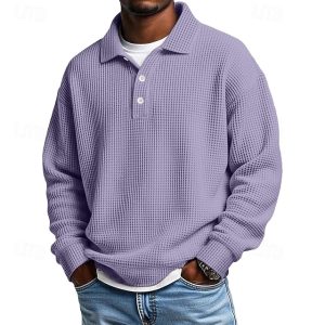 Men’s Waffle Polo Shirts Textured Formal Business Ribbed Polo Collar Long Sleeve Fashion Solid Color Buttons Plain Fall Spring & Fall Loose Fit Black Light Green Green Light Blue Purple Khaki Waffle #17887980