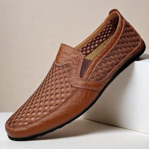 Men’s Breathable Mesh and Leather Loafers – Casual Slip-On Driving Shoes for Summer #8553939
