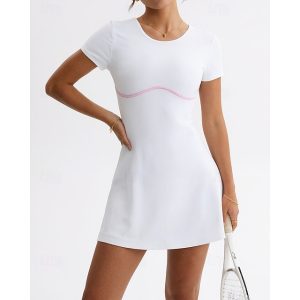 Women’s Solid Colored Tennis Dress with Shorts Sports Dress Short Sleeve Elastic Sweat-Wicking Breathable Tennis Running Fitness Crew Neck Dress White Tennis Clothing #11828733