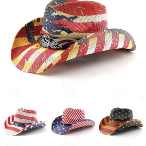 Men’s Straw Western Cowboy Hat with Patriotic Flag Prints, Breathable Woven Fedora Style in Multiple Designs, USA Independence Day Party, Festival, Vacation & Casual Wear #19323819