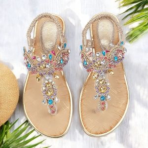 Women’s Gold Rhinestone Flat Sandals – Elegant Bohemian T-Strap Sandals for Summer, Beach Vacations, and Casual Outings #15036626