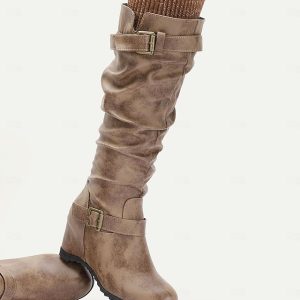 Women’s Distressed Tan Slouchy Knee-High Boots with Buckle Straps and Wedge Heel – Cozy Winter Boots with Knit Cuff for Casual Outfits #16675657
