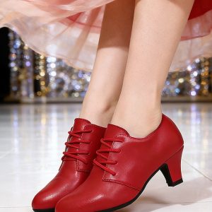Women’s Professional Latin Dance Shoes – Red Faux Leather Lace-Up Ballroom Practice Heels, Comfortable Stable Mid-Heel Salsa Tango Shoes for Dancers #13269542
