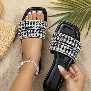 Women’s Rhinestone Slide Sandals – Sparkly Beaded Flat Slip-On Shoes for Beach Vacations, Summer Parties, Resort Wear & Daily Chic Outfits #17705987