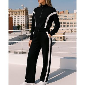 Women’s Sweatpants Zip Up Tracksuit Sportswear with Pocket Stripes Clothing Suit Fall Black White Outdoor Travel Sports High Waist Fashion Long Sleeve Sport Activewear Micro-elastic Regular Fit #17026644