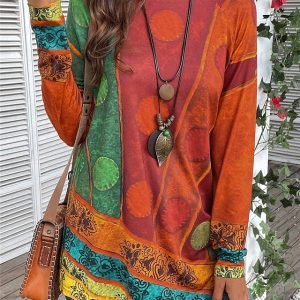 Women’s T shirt Long Sleeve Vintage Ethnic Casual Print Long Sleeve Long Tops Crew Neck Daily Red Purple Green Fall Winter Prefall #14655393
