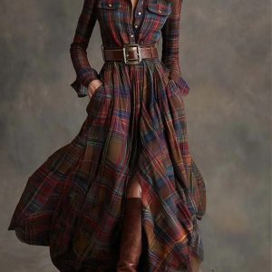 Women’s Maxi Dress Shift Dress Vacation Casual Boho Daily Regular Fit Plaid Long Sleeve Lapel Blue Dark Yellow Deep Green Black Spring Fall Winter #12919365