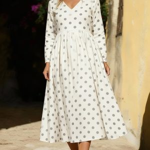 Women’s Midi Dress Casual Dress Elegant Vintage Daily Outdoor Vacation Regular Fit Polka Dot Long Sleeve V Neck White Summer Spring Fall #19984495