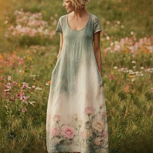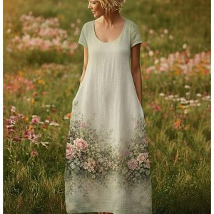 Women’s Maxi long Dress Casual Dress Vintage Daily Outdoor Beach Loose Fit Floral Short Sleeve U Neck Green Summer Spring #11896711