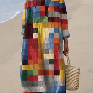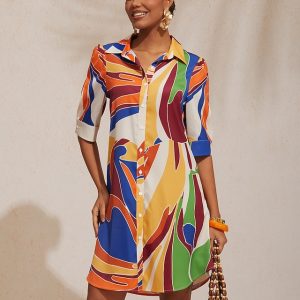 Vacation Geometric Color Block Pattern Straight Satin Shirt Dress #10399159