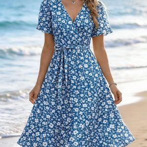 Women’s Midi Dress Casual Dress A Line Dress Elegant Vacation Cute Holiday Date Regular Fit Floral Graphic Short Sleeve V Neck Blue Yellow Pink Purple Summer Spring Fall Winter #16906222