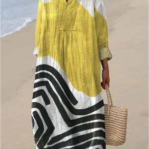 Women’s Maxi Dress Sundress Shift Dress Vacation Casual Beach Going out Loose Fit Graphic Geometric Abstract Long Sleeve V Neck Yellow Orange Dark Blue Summer Spring Fall #17900468