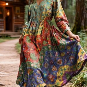Women’s Maxi Dress Sundress Shift Dress Vacation Casual Beach Going out Loose Fit Graphic Geometric Abstract Long Sleeve V Neck Blue Yellow Dark Pink Orange Summer Spring Fall #12876852