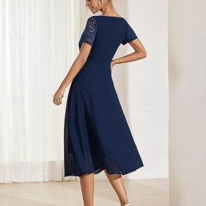 Women’s Wedding Guest Cocktail Dress Chiffon Contrast Lace Ruffle Hem Elegant Formal Midi A Line Dress Crew Neck Short Sleeve Dark Blue Color #11240950