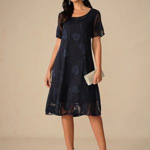 Women’s Knee Length Dress Chiffon Dress Elegant Casual Loose Fit Floral Short Sleeve Crew Neck Navy Blue Summer #13292224