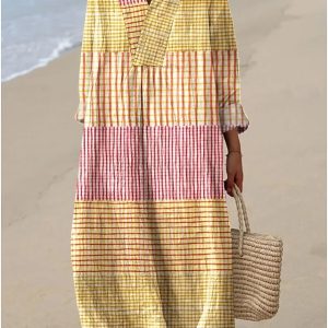 Women’s Maxi Dress Sundress Shift Dress Vacation Casual Beach Going out Loose Fit Graphic Geometric Abstract Long Sleeve V Neck Yellow Summer Spring #17862845