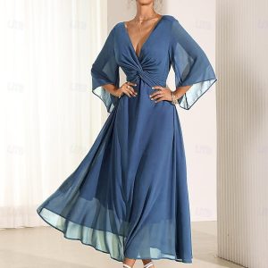 Women’s Wedding Guest Cocktail Dress Chiffon Plain Ruffle Twisted Elegant Summer Maxi Dress V Neck Flared 3/4 Length Sleeve #12241653