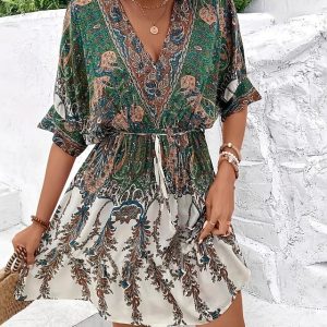Women’s Maxi Dress A Line Dress Vacation Casual Outdoor Going out Regular Fit Paisley Half Sleeve V Neck Black Green Summer Spring #18676217