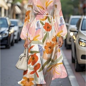 Women’s Midi Dress A Line Dress Vacation Casual Daily Evening Party Party Regular Fit Floral Graphic Long Sleeve V Neck Blue Pink Orange Beige Summer Spring #16204653