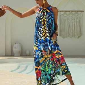 Vacation Feather Leopard Print Sleeveless Satin Camisole Maxi Dress #11522927