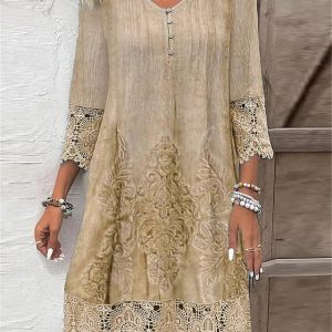 Women’s Casual Dress Boho Lace Detail V-neck Three Quarter Sleeve Vintage Pattern Relaxed Fit Beige Tan Linen Blend Spring Autumn Regular Size Outdoor Daywear #10610208