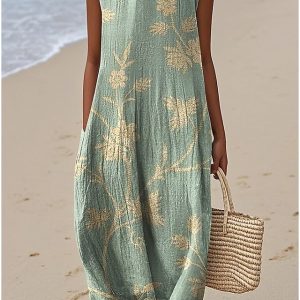 Women’s Midi Dress Linen Like Sundress Shift Dress A Line Dress Vacation Casual Boho Party Going out Beach Loose Fit Floral Graphic Sleeveless Crewneck Light Yellow Deep Green Gray Green Orange red #12459583