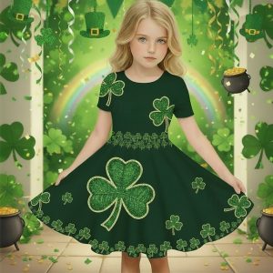 St. Paddy’s Day Girls’ 3D Graphic Four Leaf Clover St. Patrick’s Day Dress Short Sleeve 3D Print Summer Spring Daily Vacation Party Cute Basic Casual Kids 4-12 Years Casual Dress A Line Dress #10288796