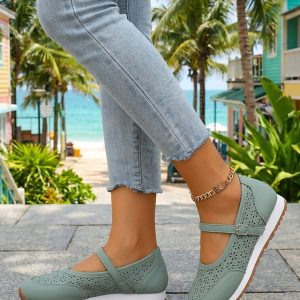 Women’s Green Mary Jane Comfort Shoes – Breathable Perforated Strap Walking Shoes for Beach Vacations, Resort Travel, City Sightseeing & Everyday Comfort #13705209