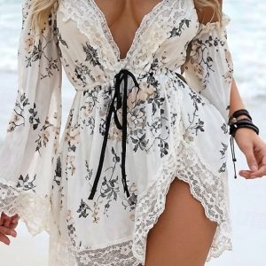 Women’s Mini Dress Boho Dress Western Dress Fashion Daily Vacation Going out Regular Fit Flower Long Sleeve V Neck White Summer #10563545